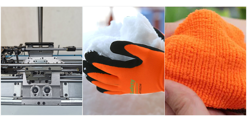 配置特制的織針及沉降片,可生產(chǎn)優(yōu)質(zhì)的毛圈手套,再加上拉毛、浸膠等后處理工藝,使手套加厚耐磨,滿足冬天、冷庫等特殊崗位的需求。