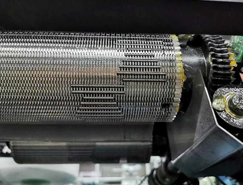 滾筒采用蝸輪蝸桿選針系統(tǒng),正反轉(zhuǎn)的新功能為手套編織時(shí)的選針提供了更多可能性,使織物的花型更加豐富。滾筒可以在任意位置實(shí)現(xiàn)超快速?gòu)?fù)位(速度是500 RPM),無(wú)需換高低針腳,可以實(shí)現(xiàn)橡筋一隔一,一隔二等自由切換。